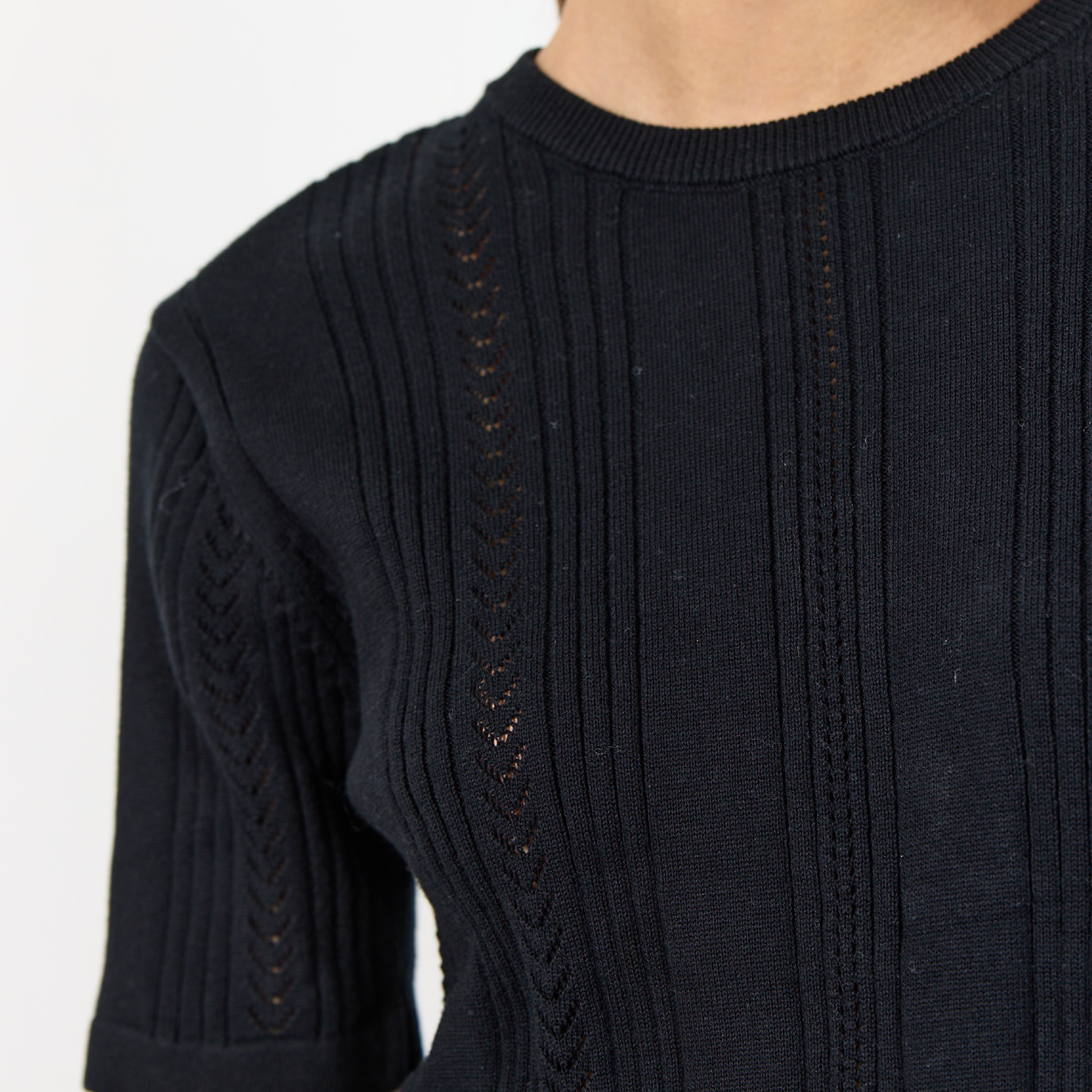 Skøn og blød basic t-shirt fra Leveté Room, i ren økologisk bomuld. T-shirten har korte ærmer, rund hals - og et fint strikmønster.