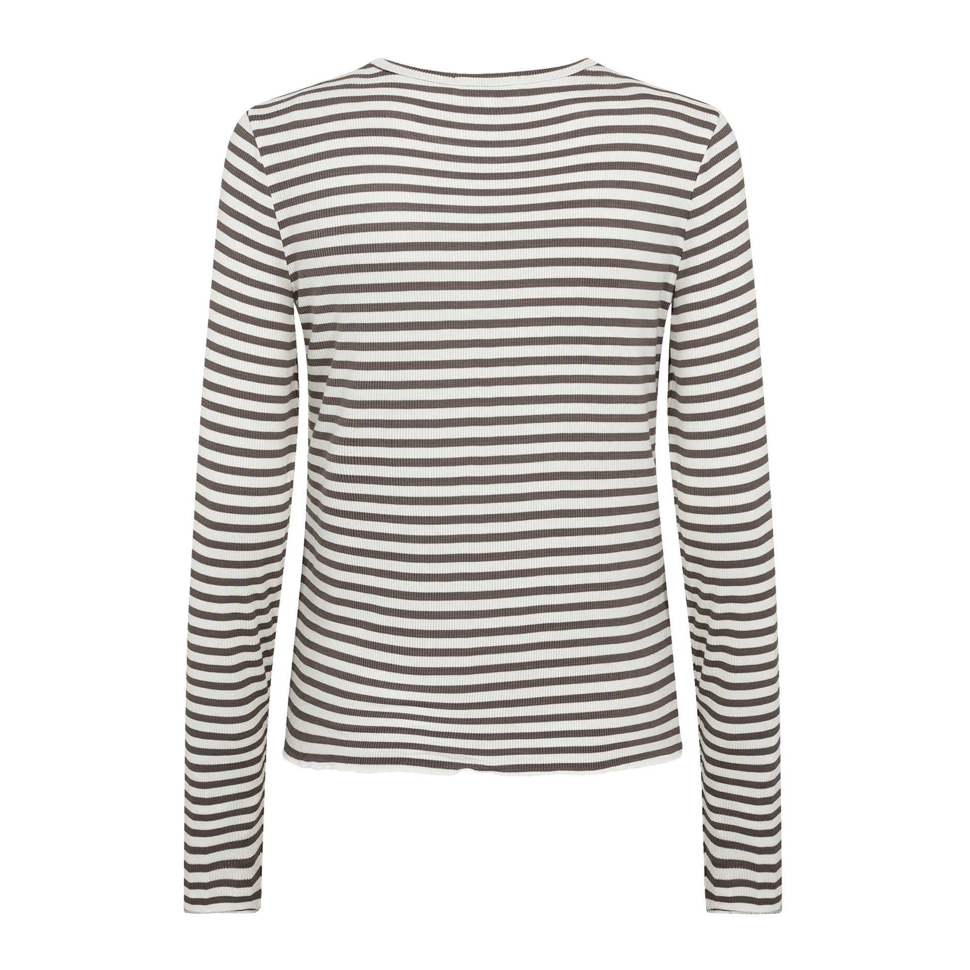 Flot og enkel stribet bluse i tynd rib fra Leveté Room. Blusen har rund halsudskæring, lange ærmer og krølkant forneden og ved ærmerne. Derudover er blusen blød og i en lækker tynd ribkvalitet.
