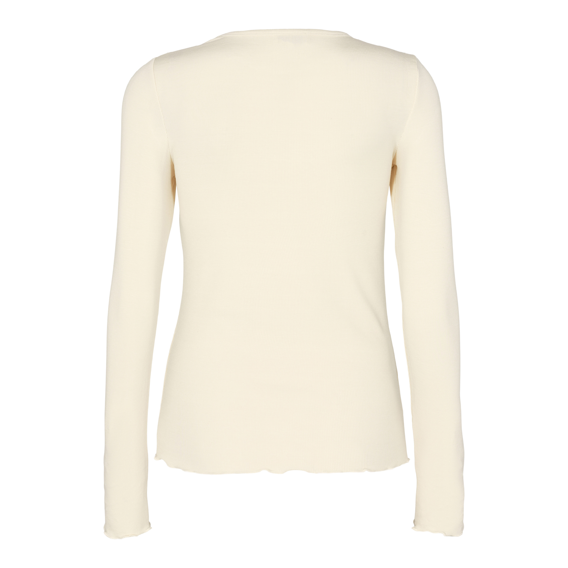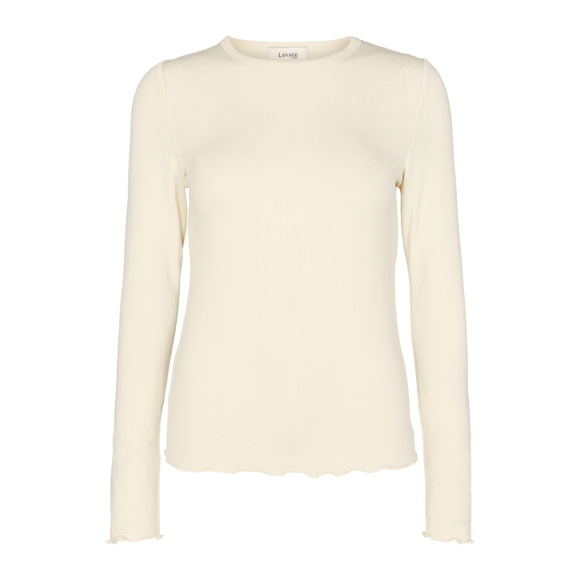 Beautiful and simple off-white blouse in thin rib from Leveté Room. The blouse has a round neckline, long sleeves and curled hem at the bottom and at the sleeves. In addition, the blouse is soft and in a delicious thin ribbed quality.