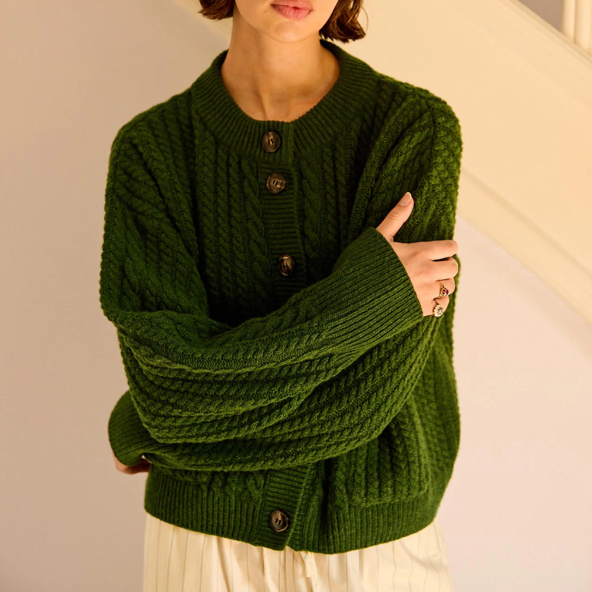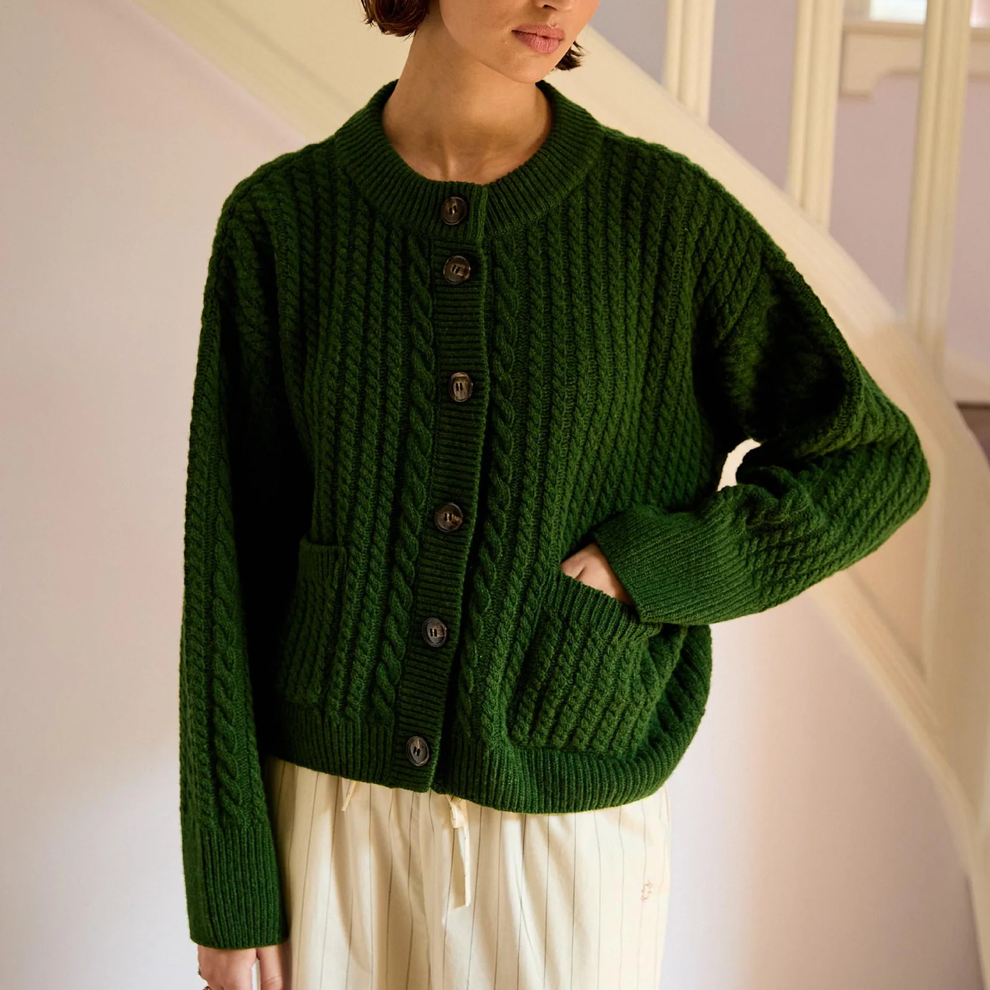 Gertrud Cable Sweater fra det danske brand, Proem Parades. En chunky, blød og iøjnefaldende strik - med et tidløst twist, designet til at holde i årevis. Kabelstrikningen tilføjer rig tekstur og en følelse af stille luksus. Med sin kasseformede, let croppede pasform fungerer den perfekt som en sensommerjakke eller et hyggeligt hverdagslag. Den dybe kaktusgrønne nuance tilføjer et dristigt, smukt touch til ethvert outfit.