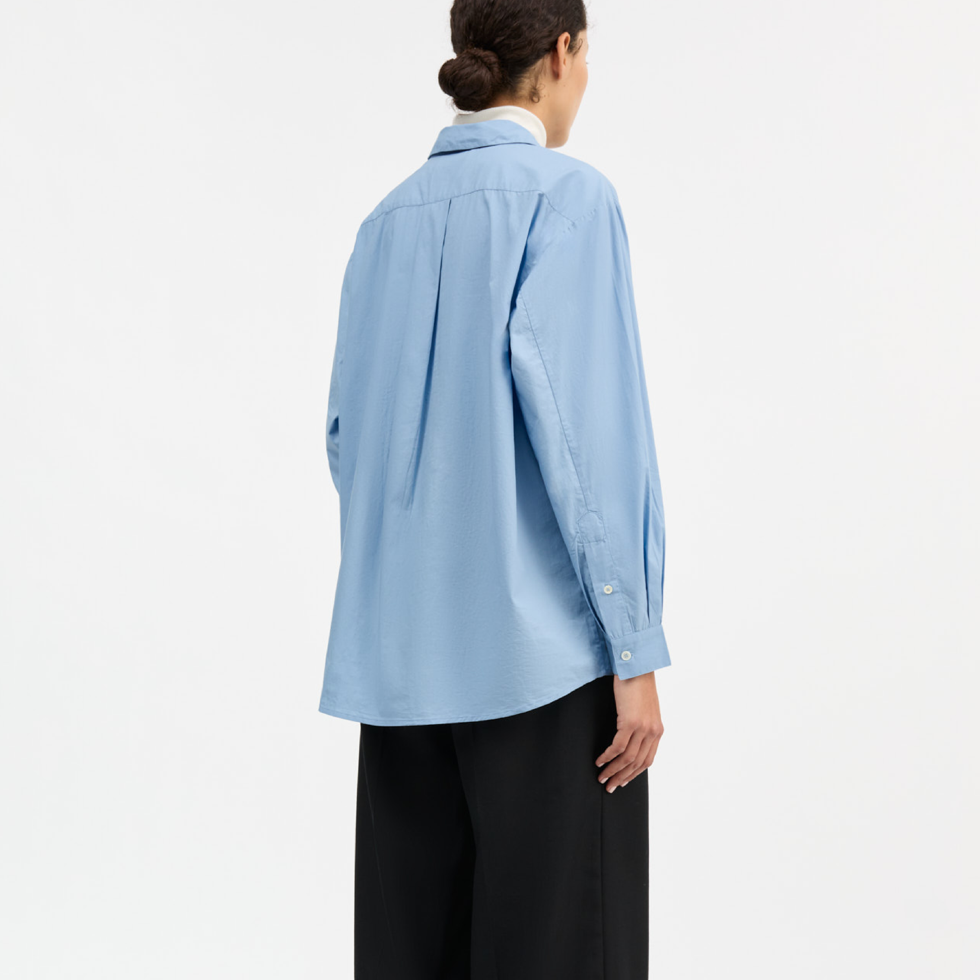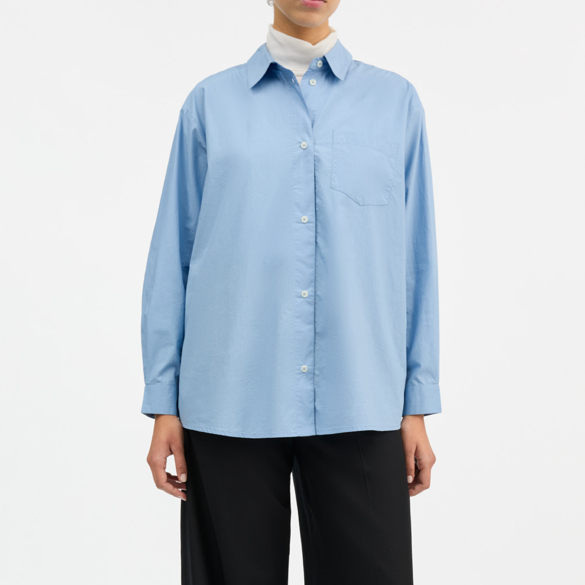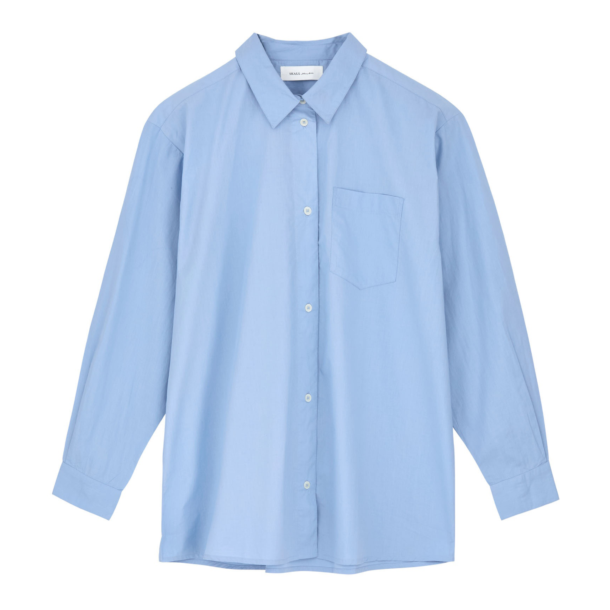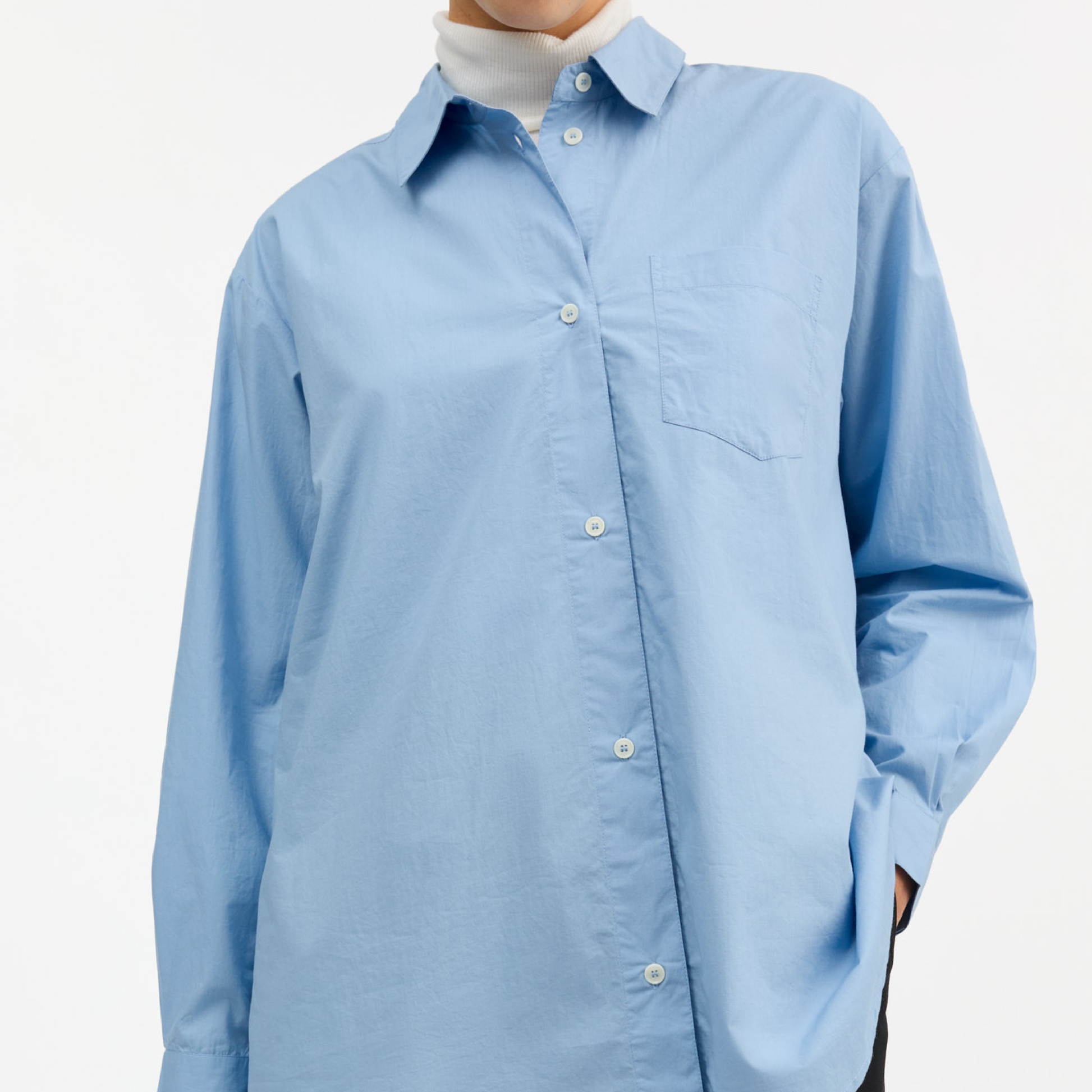 Den klassiske Edgar skjorte fra Skall Studio, i en smuk blå farve. Edgar Shirt har et løst og oversized fit, og er fin både lukket - eller åben f.eks. med en klassisk Edie Tank Top under.
