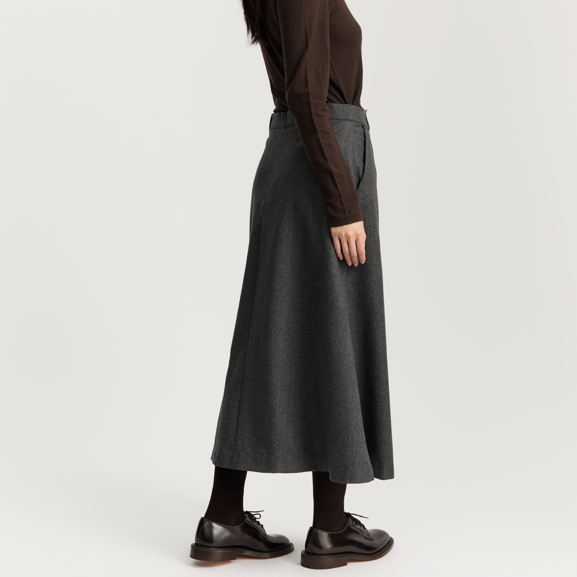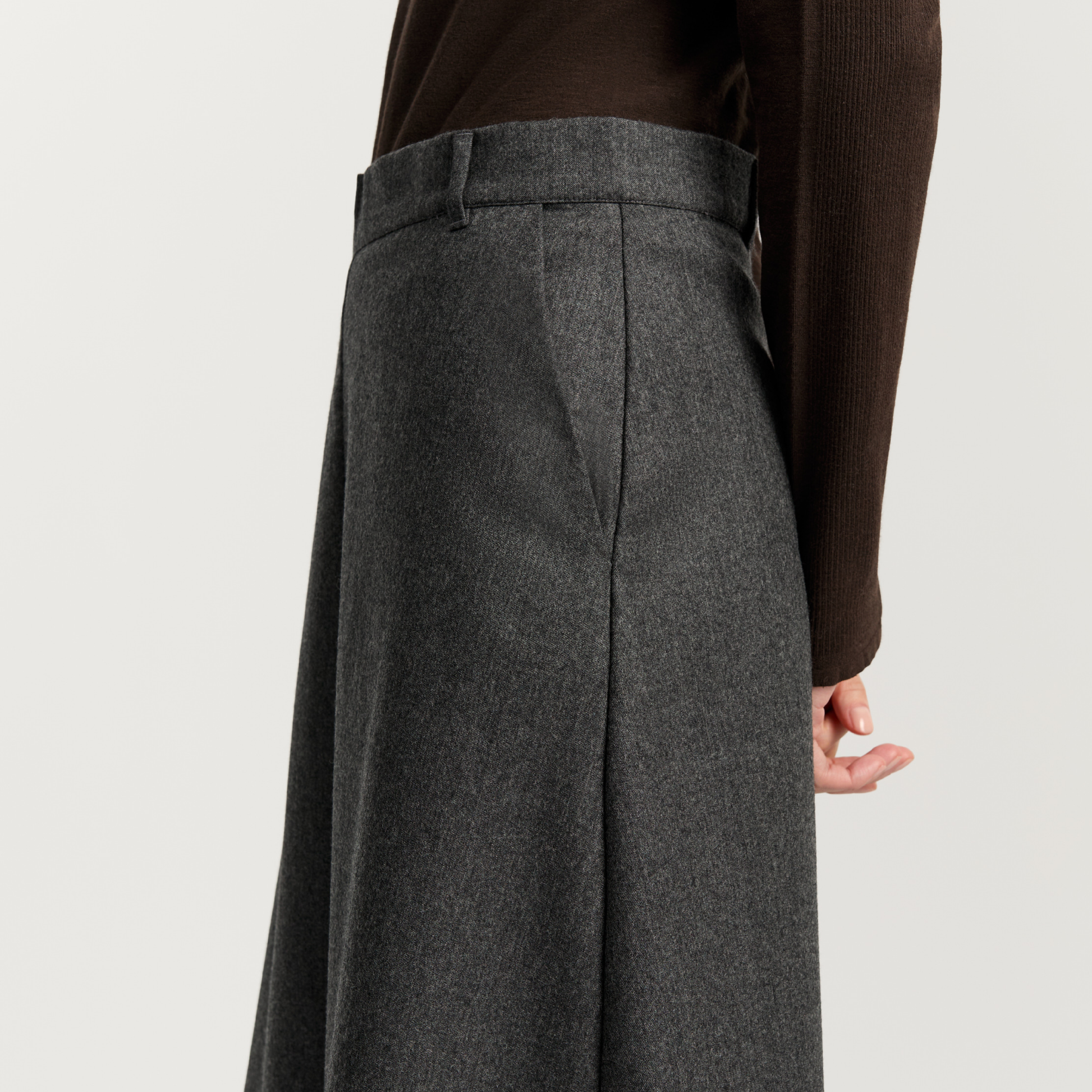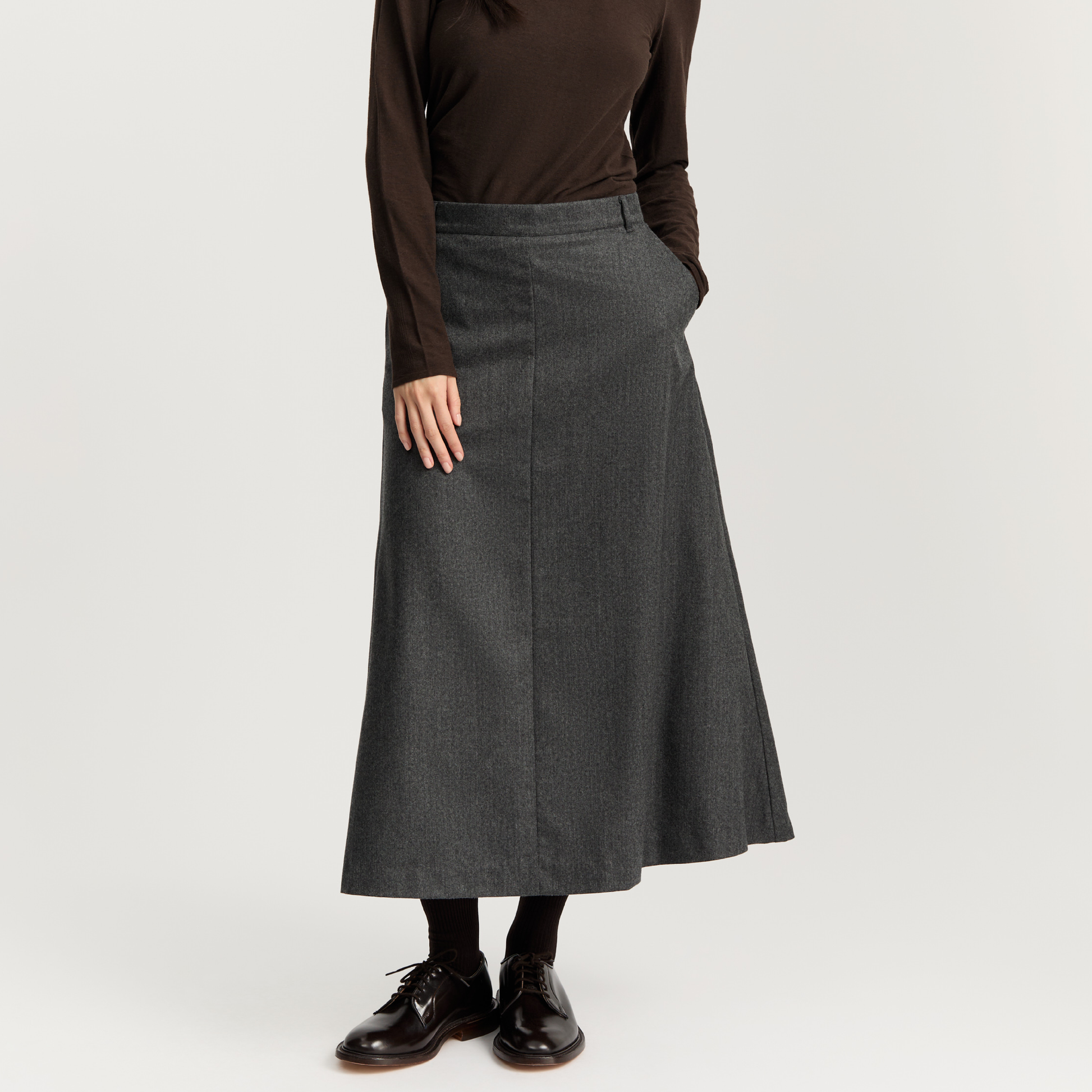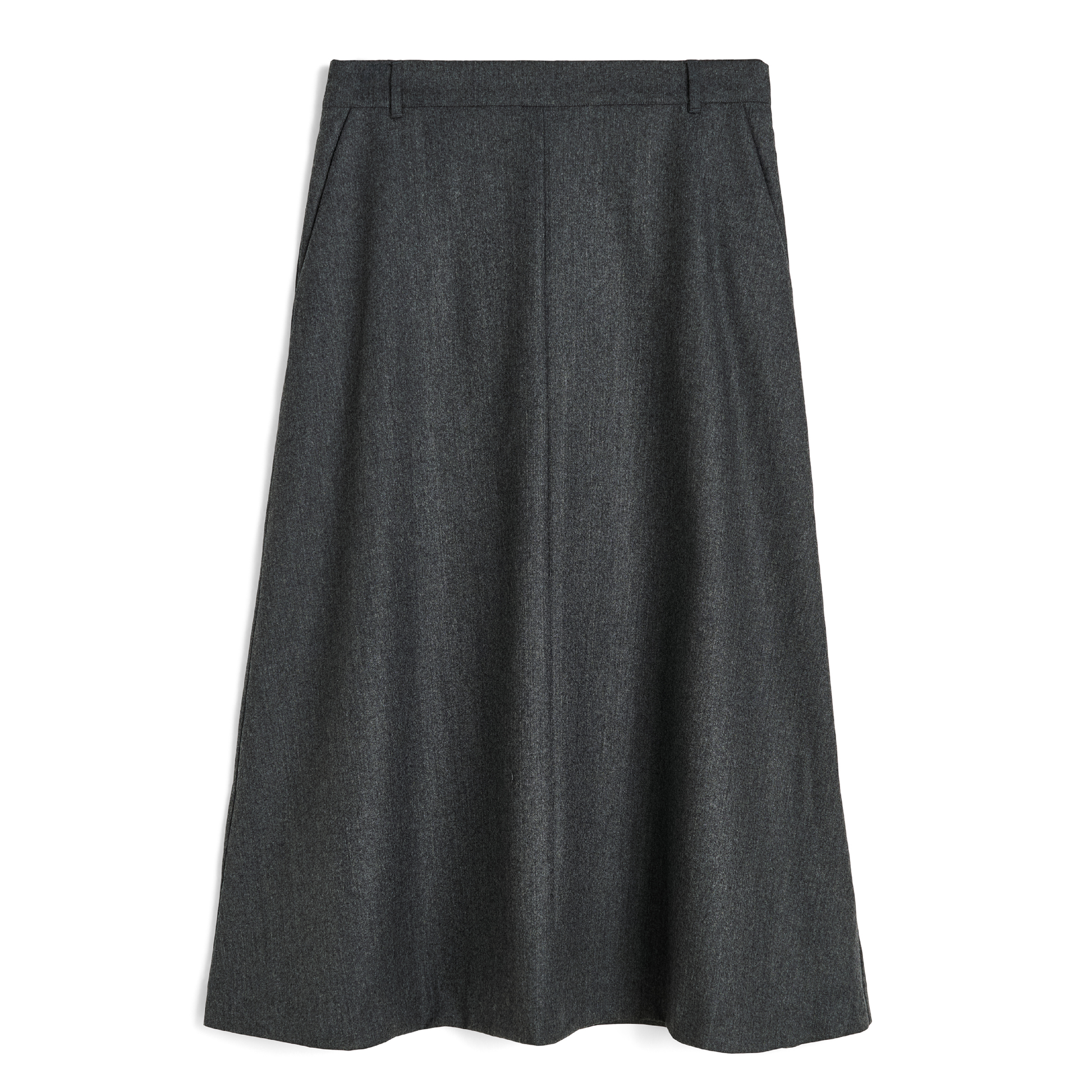 En tidløs, mellemlang nederdel fremstillet i raffineret, blød uld. Nederdelen ertætsiddende i taljen med en let A-formet silhuet. Detaljerede bæltestropper, en lynlåslukning samt skrå indsnit giver et elegant, draperet udtryk.
