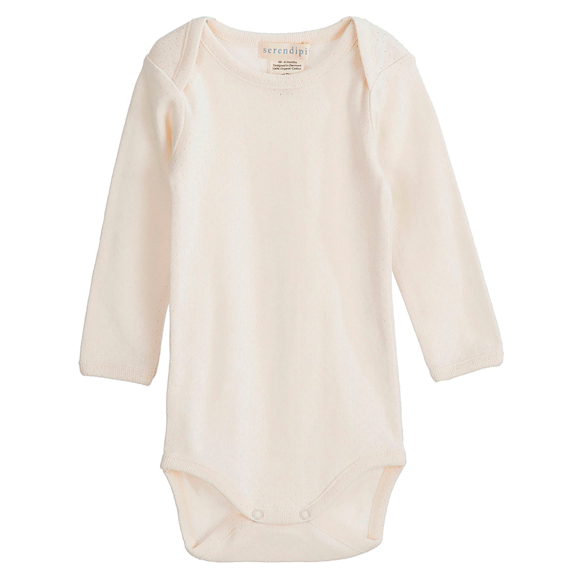 Blød langærmet body i det fineste hulmønster fra Serendipity Organics. Body'en er fremstillet i en blød økologisk bomuld, og lukkes med trykknapper ved bleen.