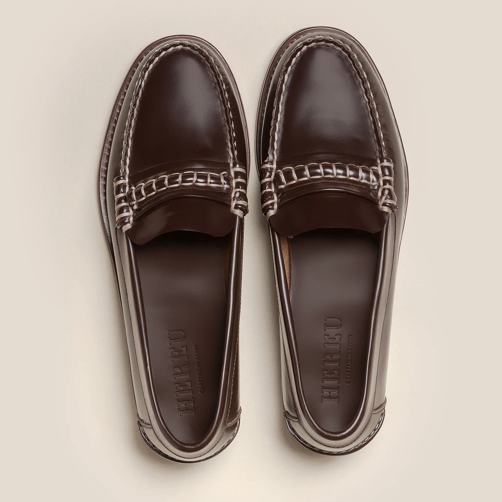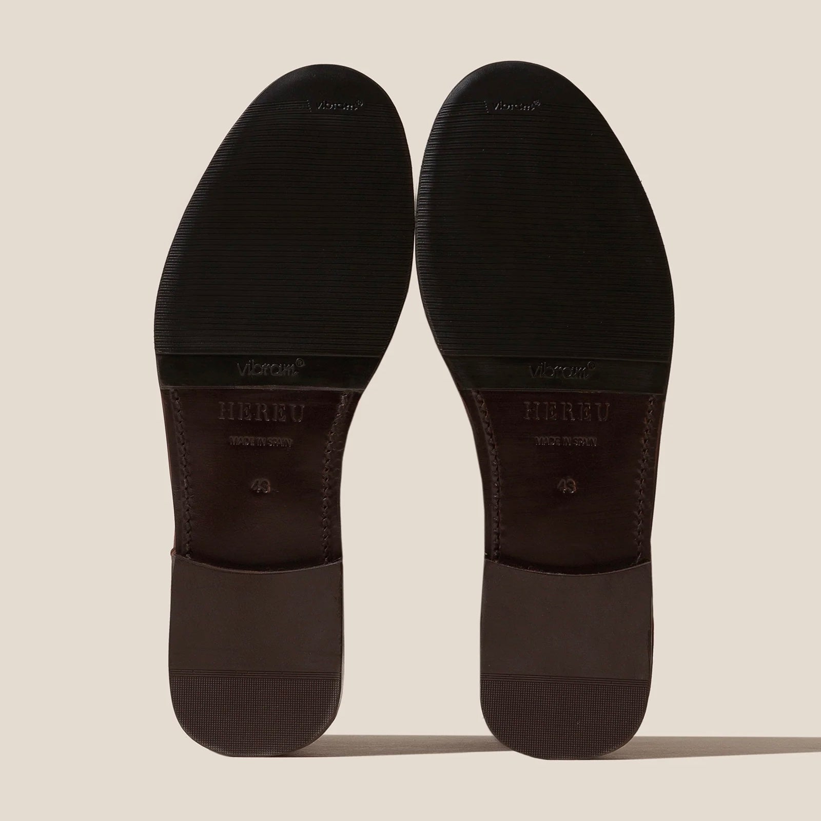 Den klassiske Bonsdag t-bar loafer i farven 'Dark Brown' fra HEREU. Skoen er håndsyet i spanien med traditionelle mokkasinkonstruktion i spansk kalveskind, og lukkes med et justerbart spænde foran.