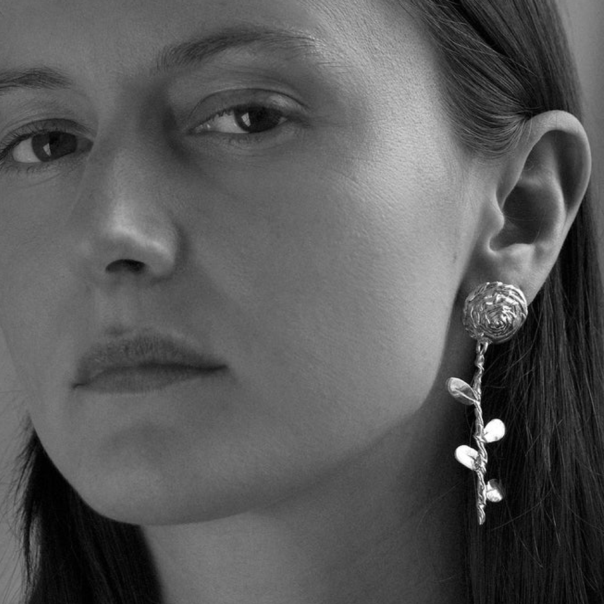 Håndlavet ørering i genanvendt sterlingsølv fra Corali, med deres karakteristiske og klassiske rosenknopform med stilk og fire blade. Kan bæres som en enkelt ørering eller som et par. Øreringen har en stiklås på bagsiden og leveres med butterfly-lås.