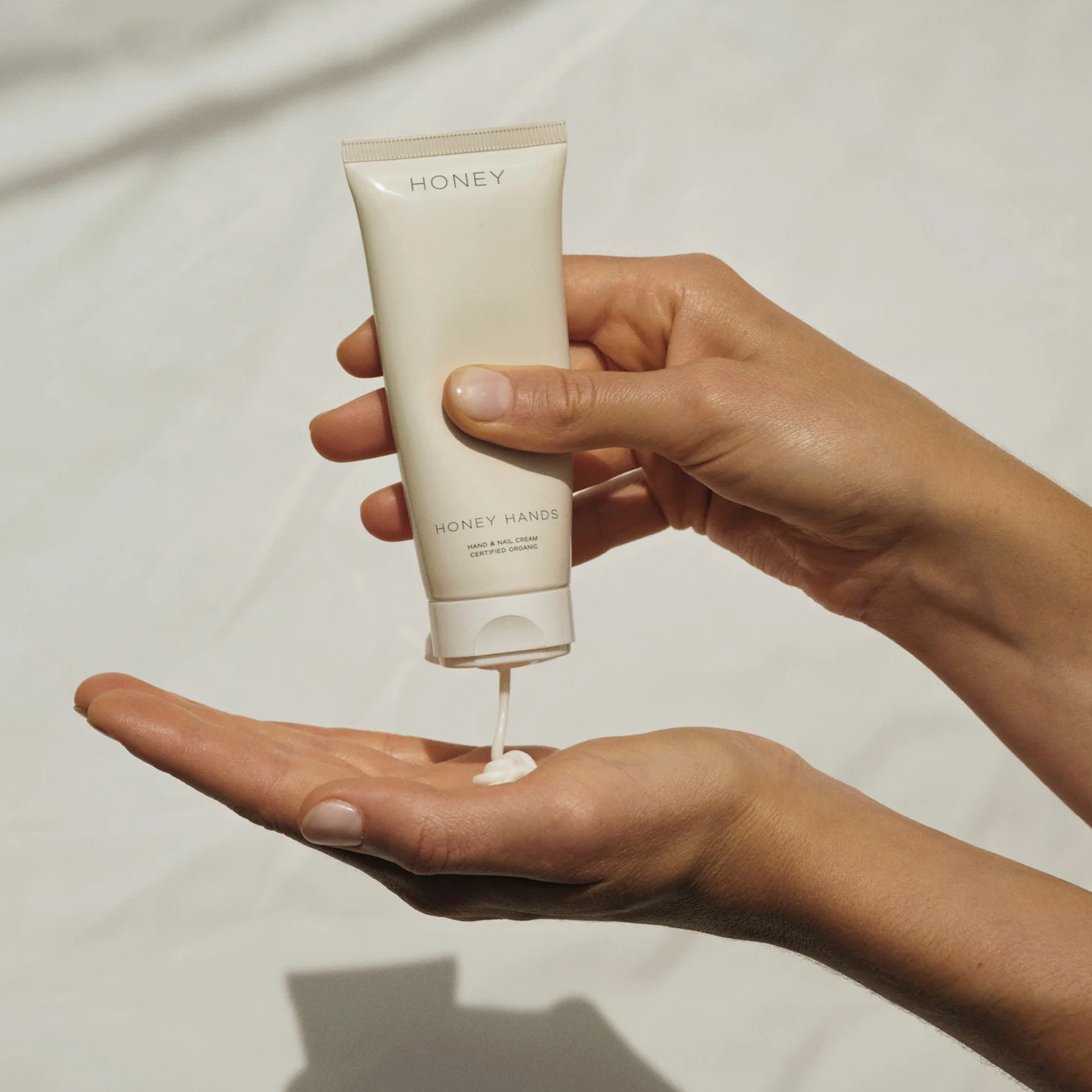 HONEY Hands er formuleret med økologisk avocadoolie, der forbedrer hudens struktur og styrker både hud og negle. Økologisk sheasmør beskytter og holder på fugten, økologisk aloe vera beroliger og fugter, mens squalane fra oliven er med til at genskabe hudens elasticitet. Den fungerer også som neglepleje, perfekt til at massere ind i neglebåndene, så hænder og negle får ekstra glans og pleje.