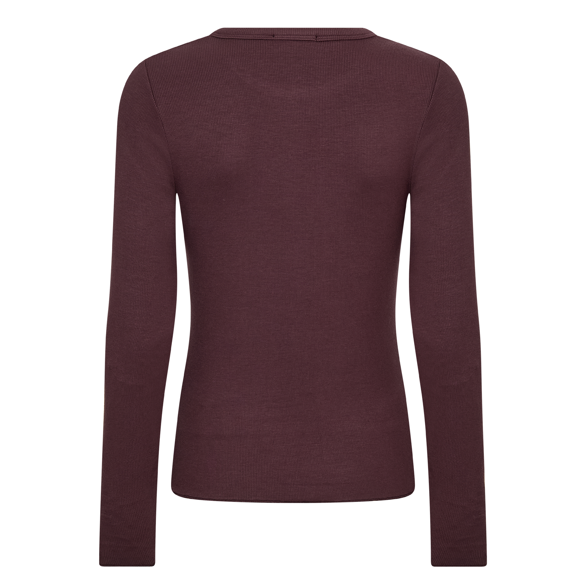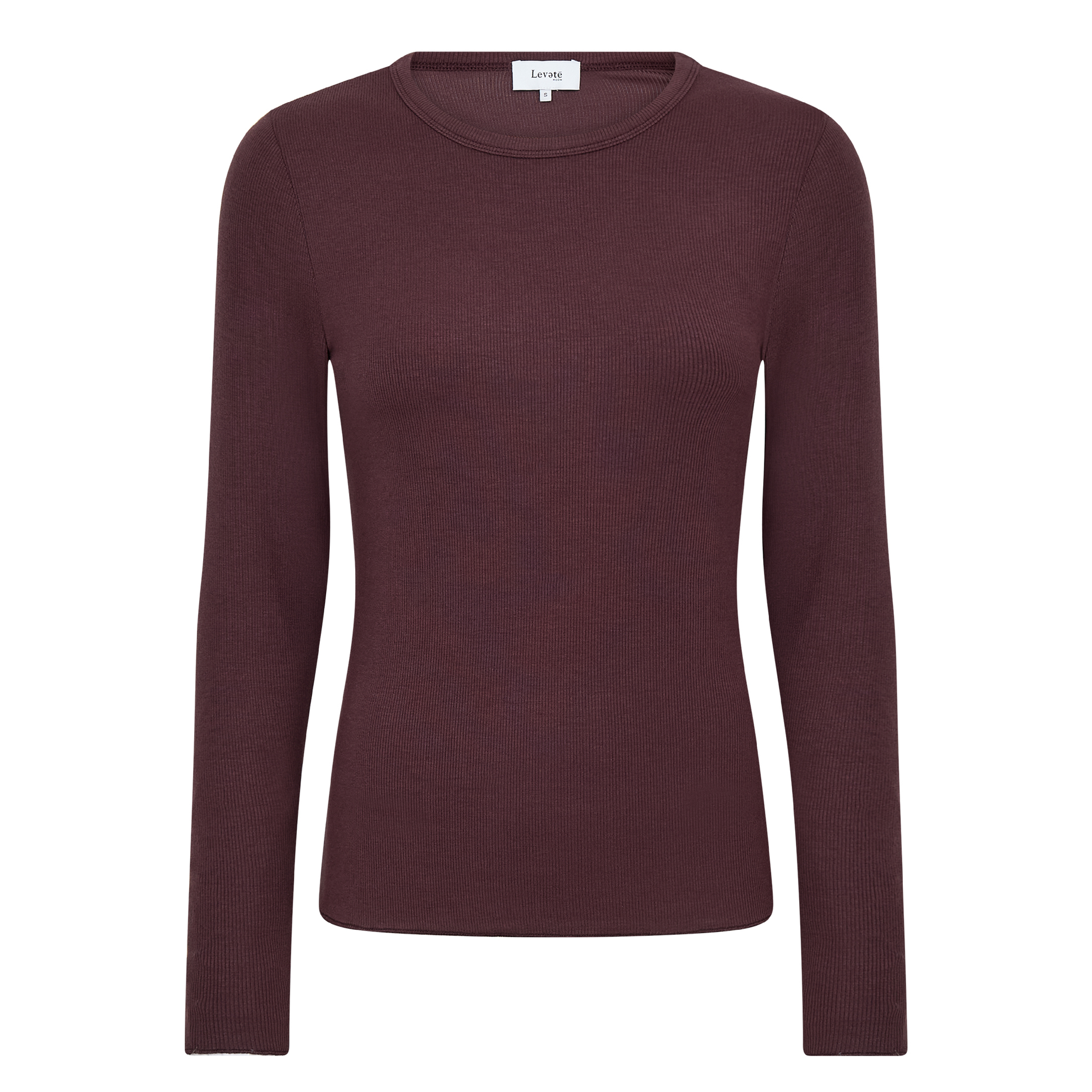 Flot og enkel bordeaux bluse i tynd rib fra Leveté Room. Blusen har rund halsudskæring, lange ærmer og krølkant forneden og ved ærmerne. Derudover er blusen blød og i en lækker tynd ribkvalitet.