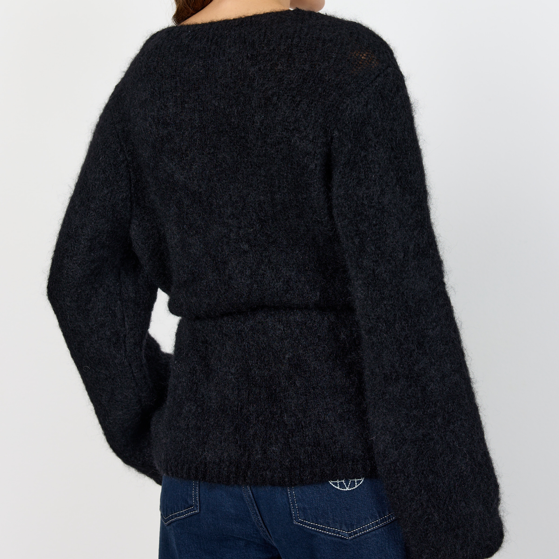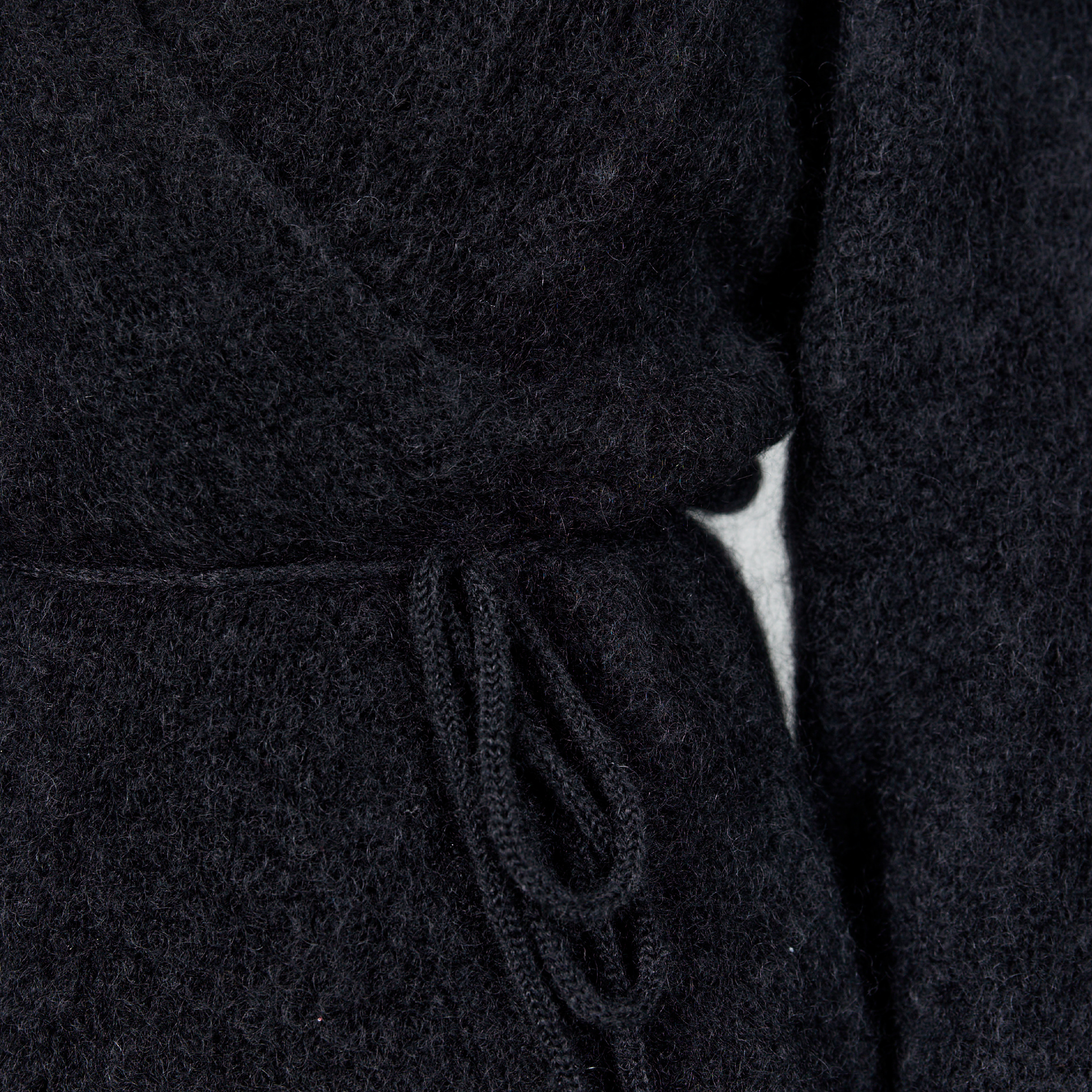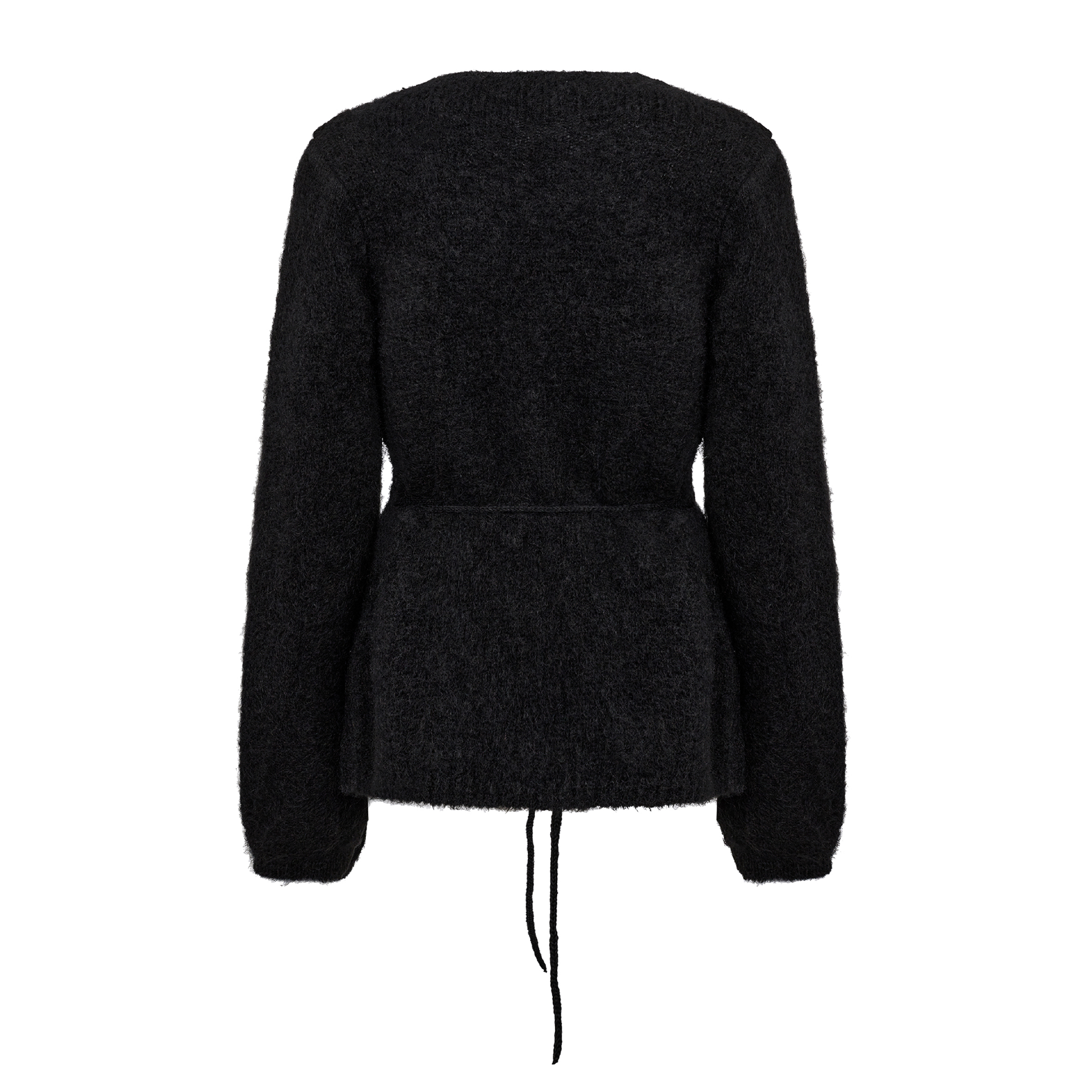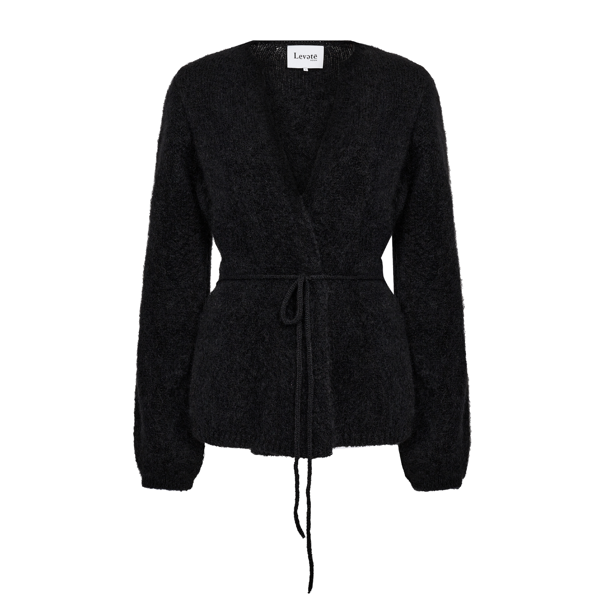 Skøn cardigan fra Leveté Room. Denne elegante cardigan har en klassisk V-hals, et bindebånd i taljen og lange ærmer med en blød tekstur.