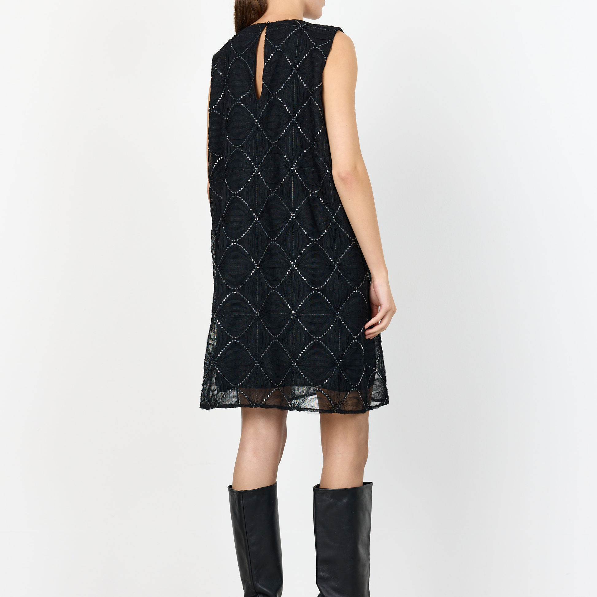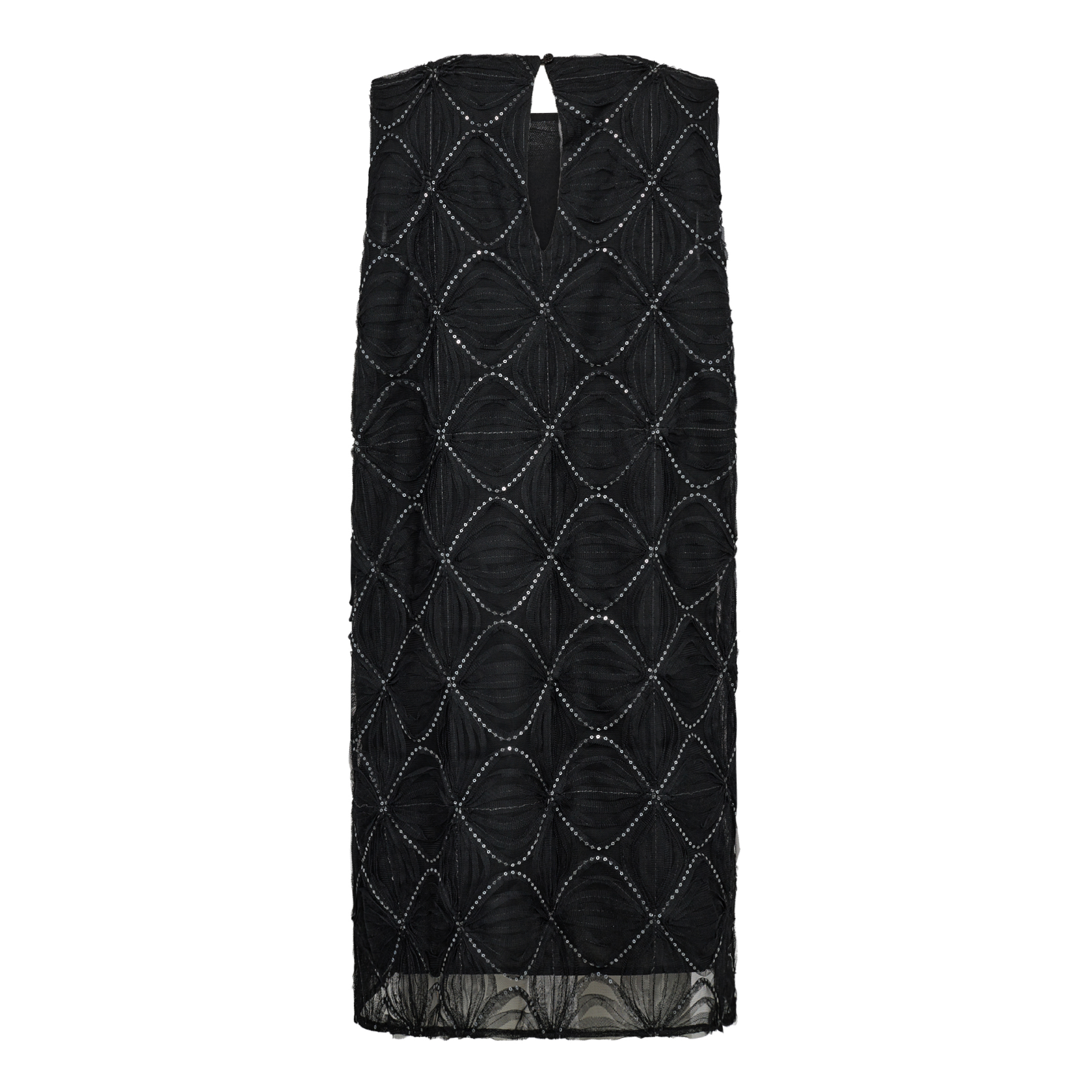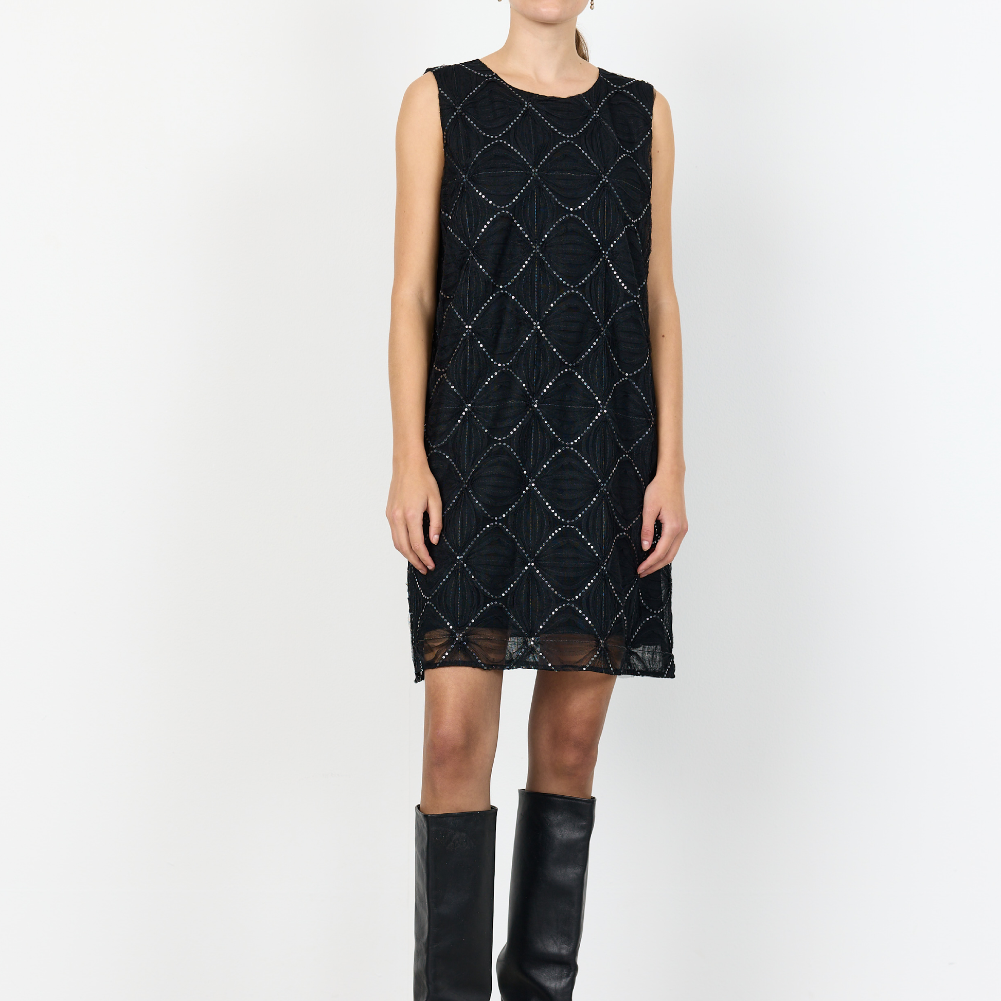 Opaya kjole fra Levete. Kjolen har et ærmeløst design, rund halsudskæring, minilængde og et iøjnefaldende geometrisk mønster.