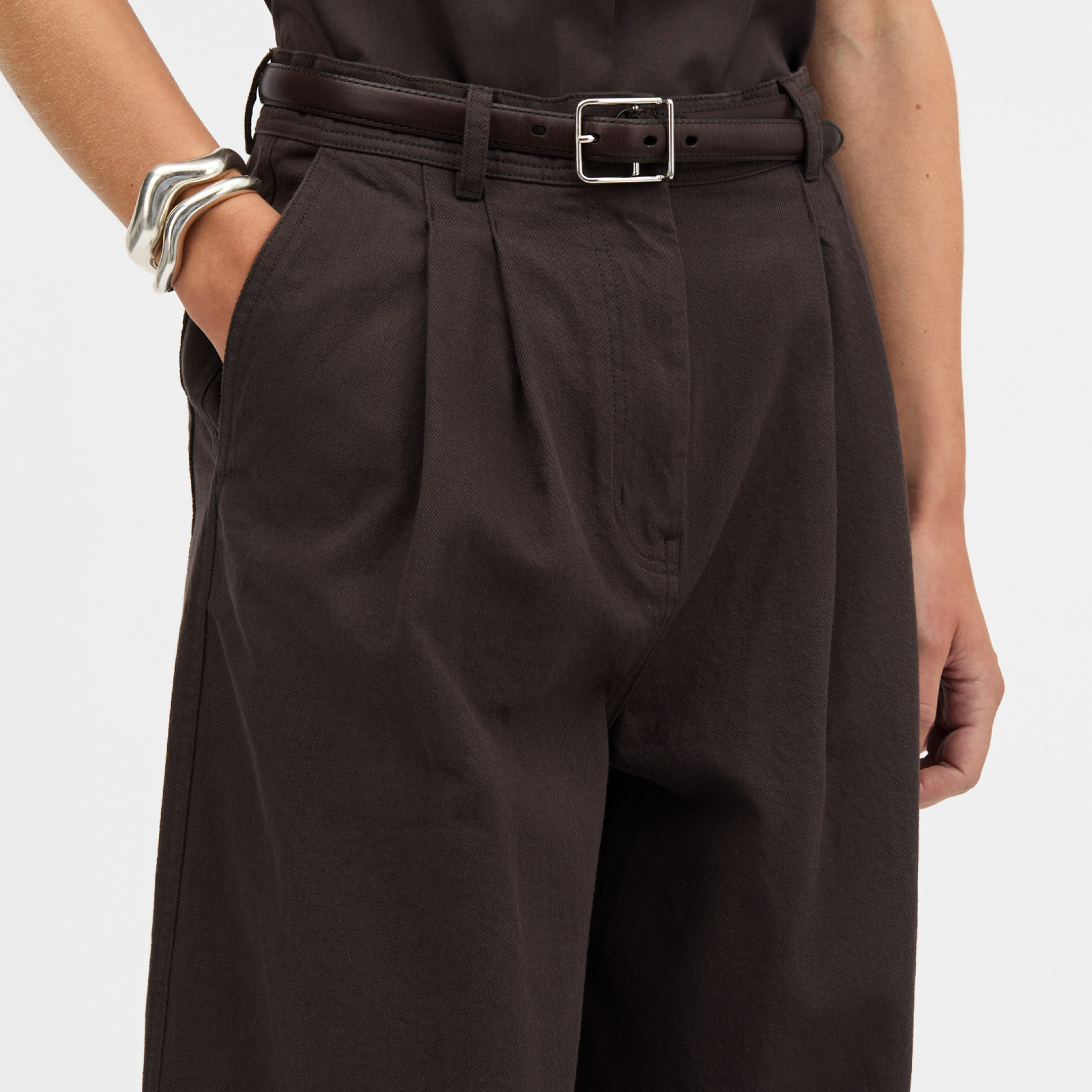 Prairie Cotton Twill bukser i en smuk mørkebrun fra MKDT Studio. Bukserne har en høj talje, læg foran ved og brede bukseben.