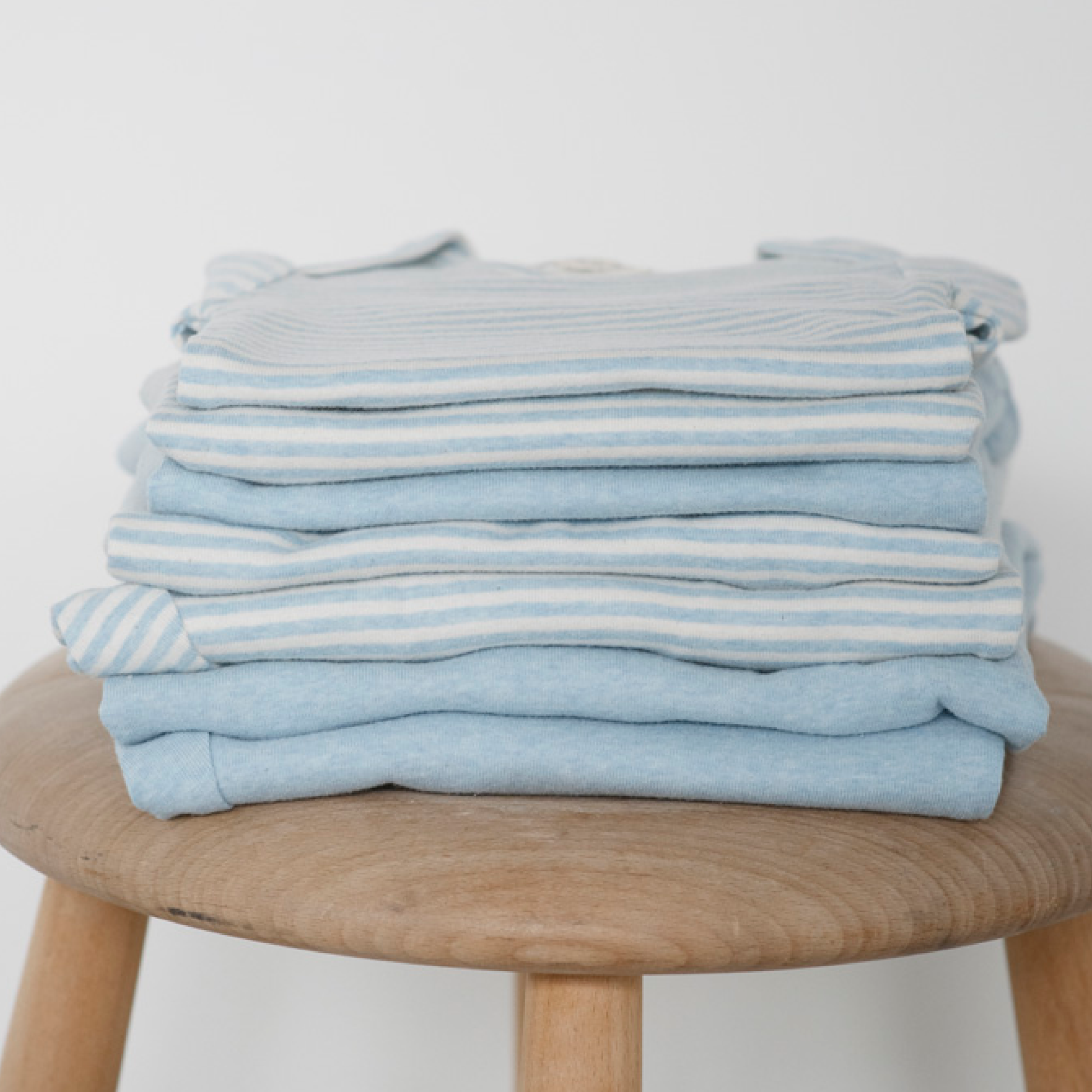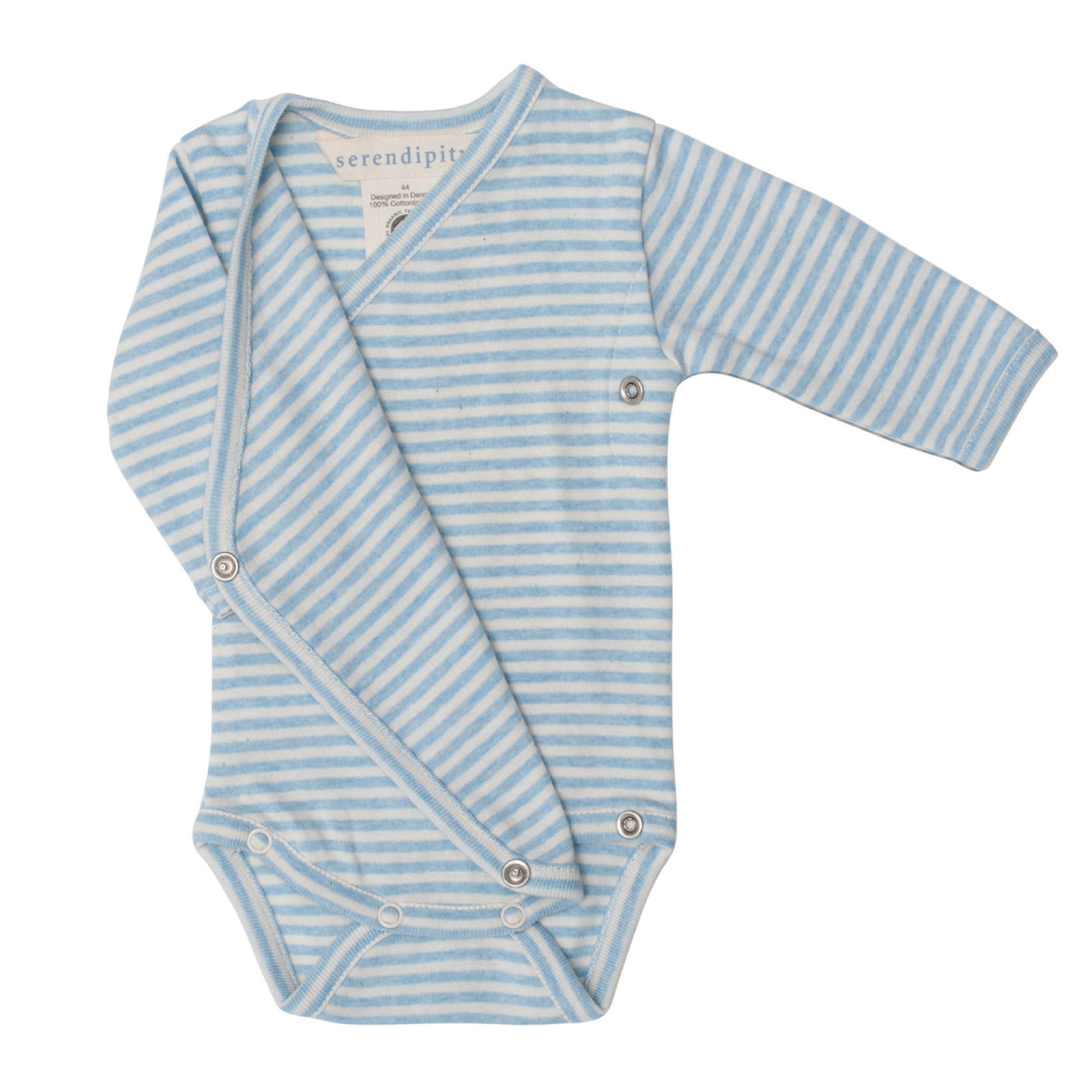 Blød langærmet slå-om body i de fineste striber fra Serendipity Organics. Body'en er fremstillet i en blød økologisk bomuld, og lukkes med trykknapper i siden og ved bleen.