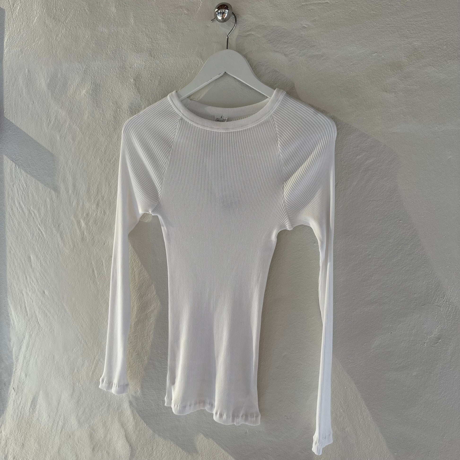 Bomuld Langærmet Rib Bluse, Hvid 7161