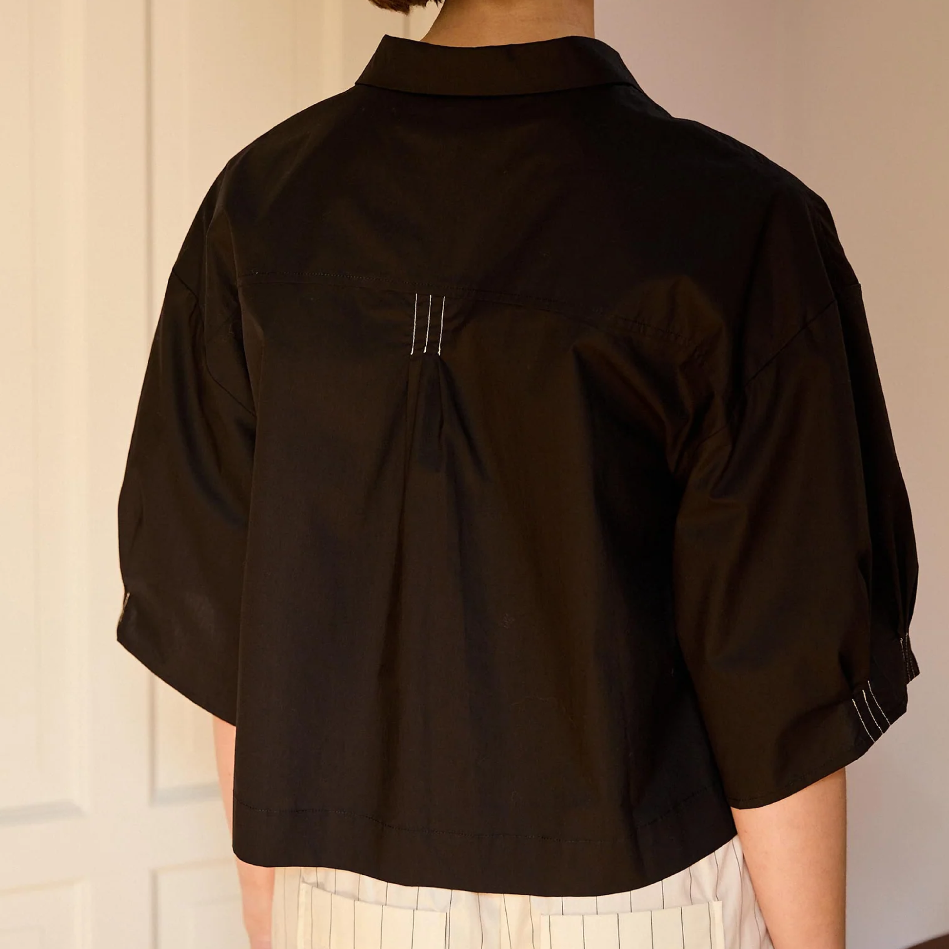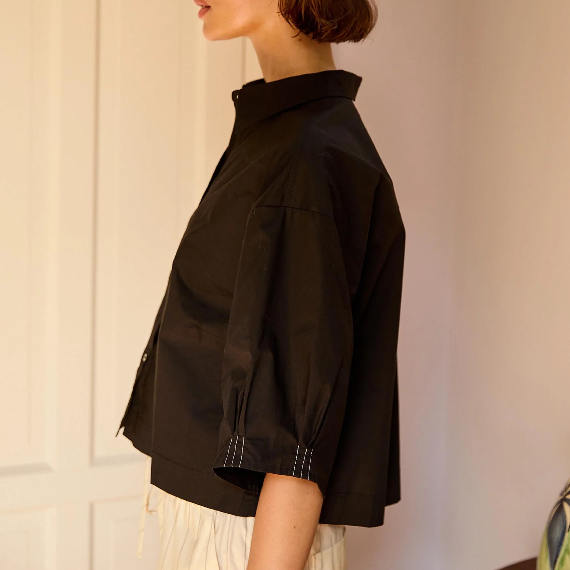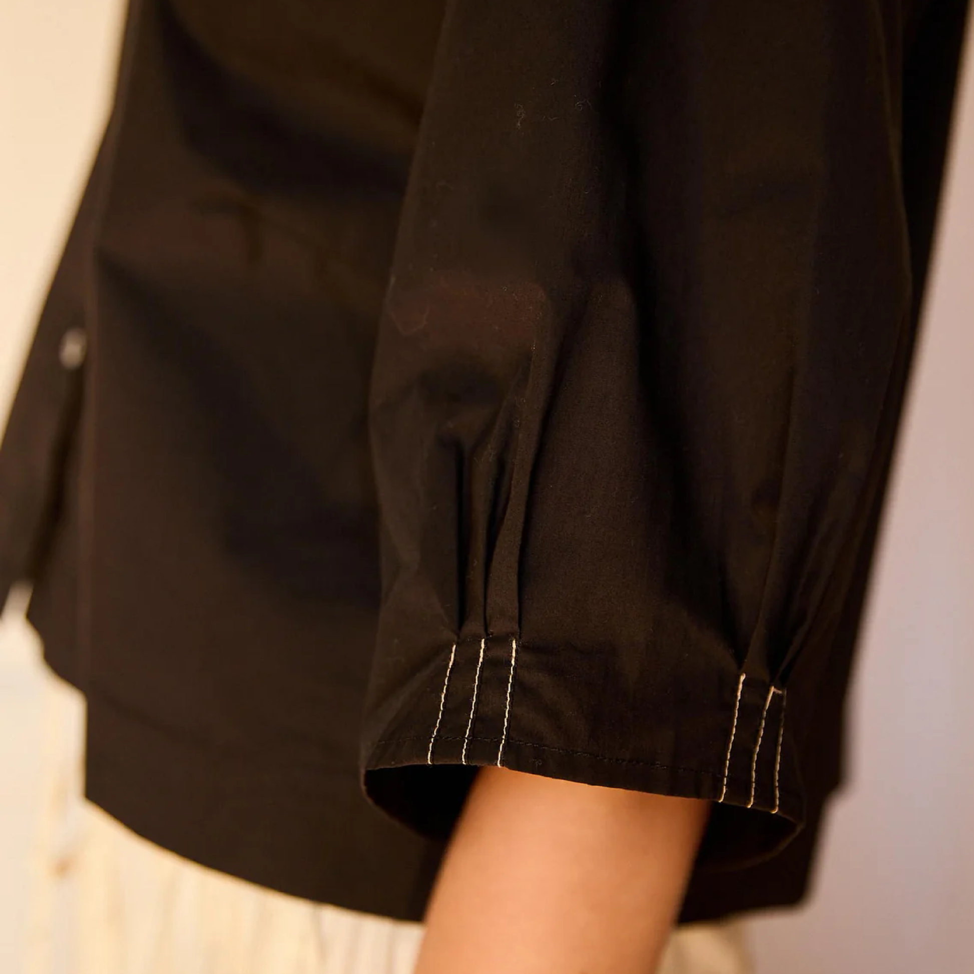 Eloise Shirt fra det danske brand, Proem Parades. Den klassiske skjorte, du altid har brug for, med et ekstra touch af noget særligt. Let cropped, voluminøs form, skarp krave og de små lægdetaljer omkring ærmeåbningen med en kontrasterende kamelsøm.