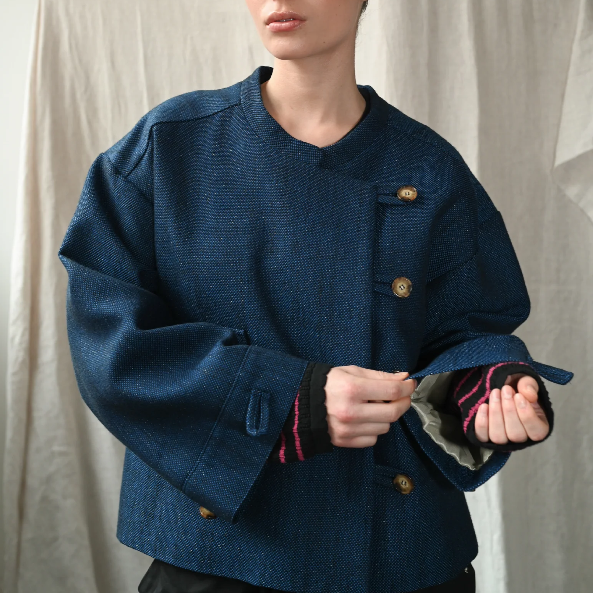 Designet med en ekstraordinær sans for detaljer og udstyret med asymmetrisk frontlukning med håndlavede hægter i samme stof - en elegant reference til 1920’ernes herreskrædderi. Det teksturerede stof, vævet af indigoblå, sorte og hvide tråde, har en unik dybde og karakter. Fremstillet i en eksklusiv viskose-uld-blanding fra danske Kvadrat. Det nøje udvalgte restmateriale sikrer et helt særligt og eksklusivt udtryk.