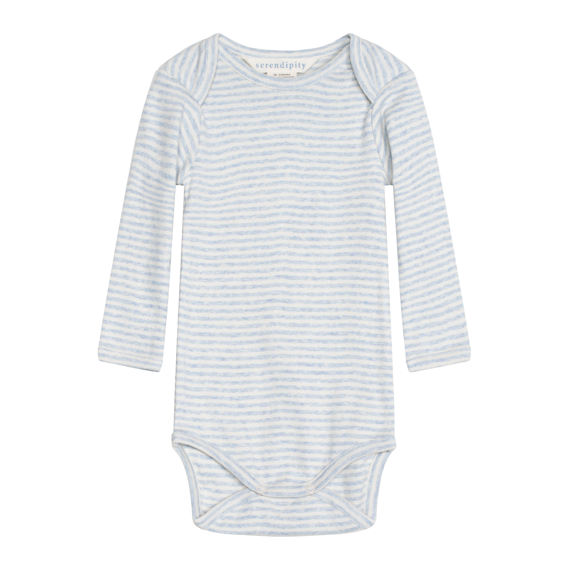 Blød langærmet body i de fineste striber fra Serendipity Organics. Body'en er fremstillet i en blød økologisk bomuld, og lukkes med trykknapper ved bleen.