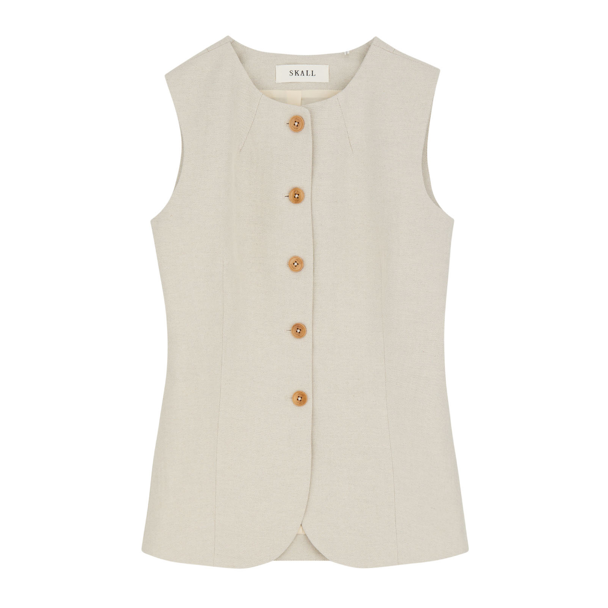 Den smukke Clementine vest fra Skall Studio. En længere skræddersyet vest, med rund hals og knaplukning - i den skønneste kvalitet af hør og bomuld