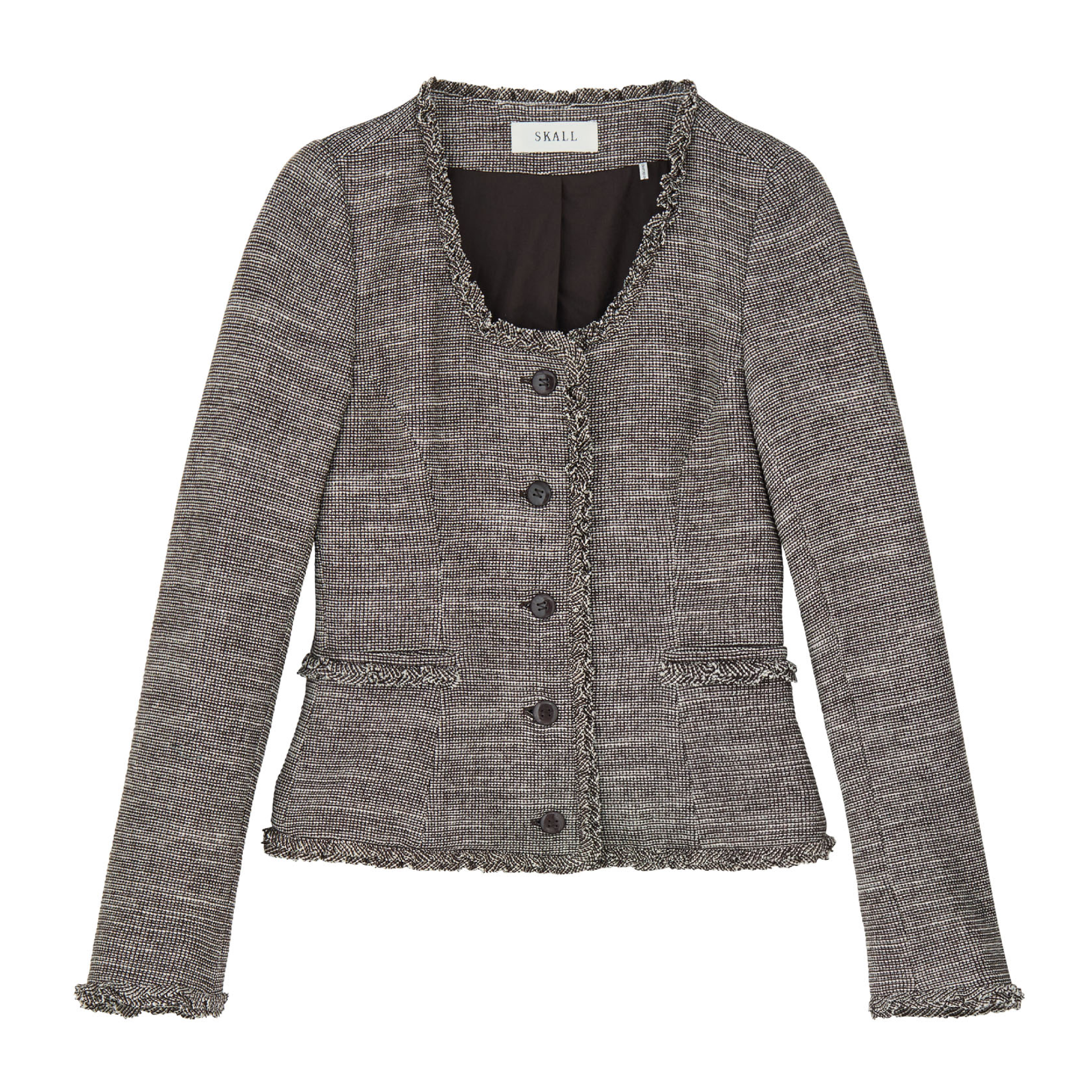 Rosa Jacket er en kraveløs, figursyet jakke med et langt og elegant snit, fremstillet i en blanding af økologisk bomuld og uld. Den lukkes med knapper foran og ved manchetterne og har rå kantebånd langs halsudskæring, søm og ærmer. Foran sidder to funktionelle påsatte lommer med samme rå detalje. Jakken er fuldt foret.