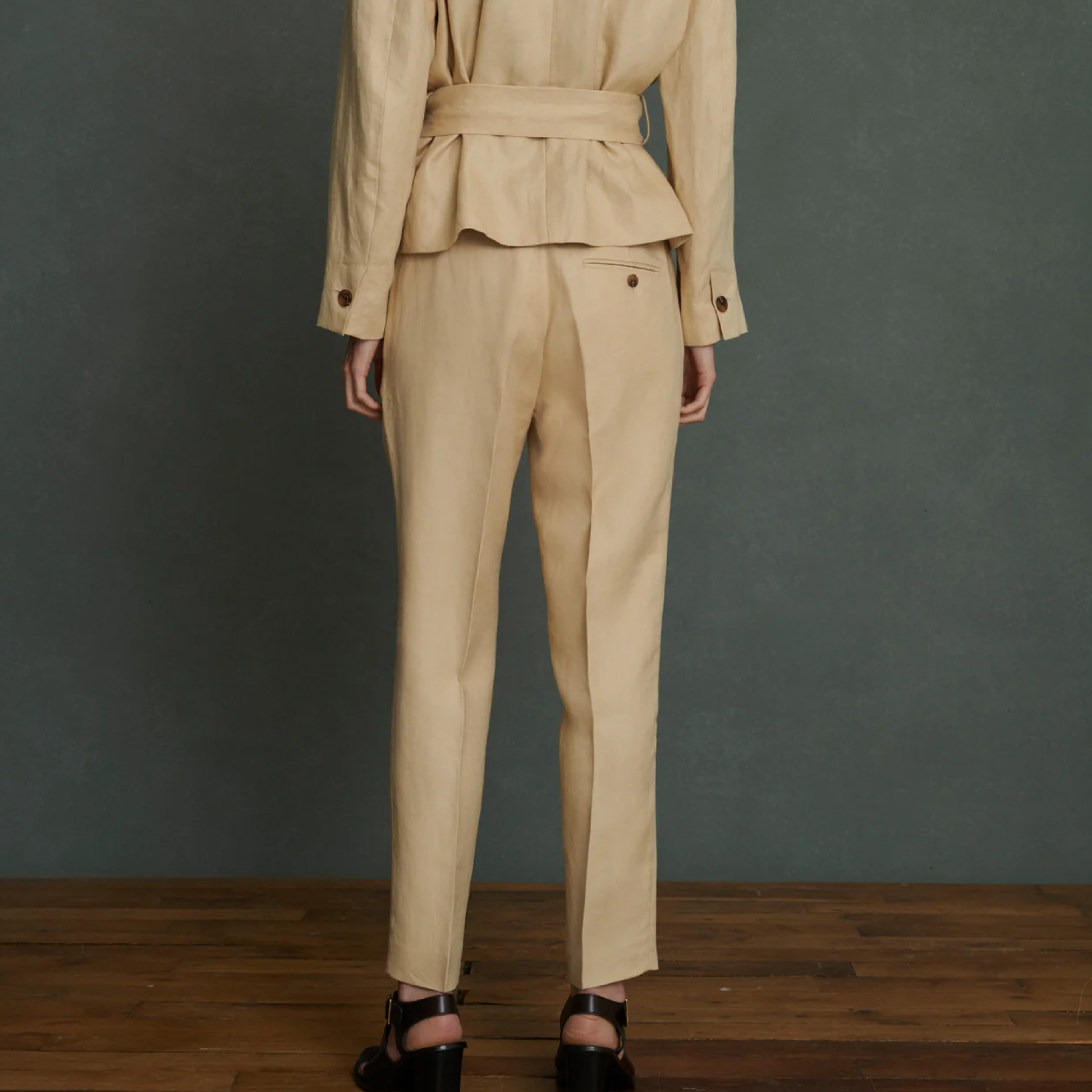 De skønne Adele bukser fra det franske brand, Soeur, i en skøn hørkvalitet. Bukserne har et klassisk cigaretbuks-look, og åbnes med knap og lynlås foran.